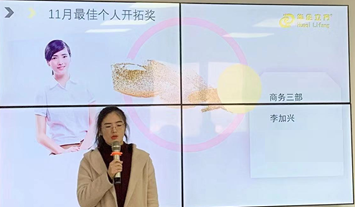 11月销售大会个人冠军是商务一部的滕涛。她是当之无愧的华企一线领军人物,作为榜样她学习改变争取赢的结果,持续不断做好每个细节,她永远都在大家的注目中。